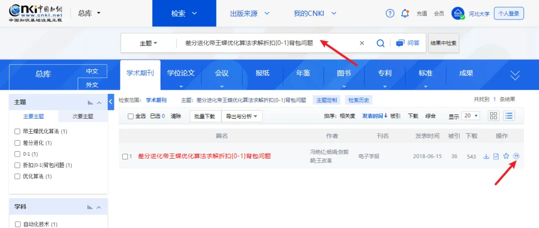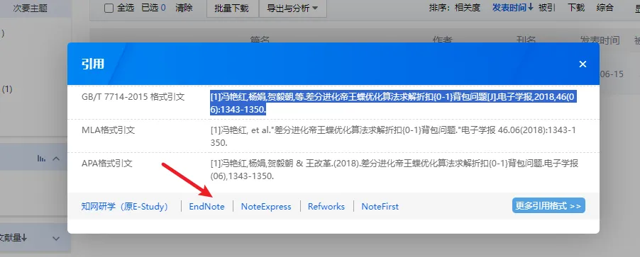 在谷歌学术、百度学术或知网上搜索自己需要的文献,输入文献名字(以知网为例),搜索出来后,点击名字下方的引用,如图所示:
