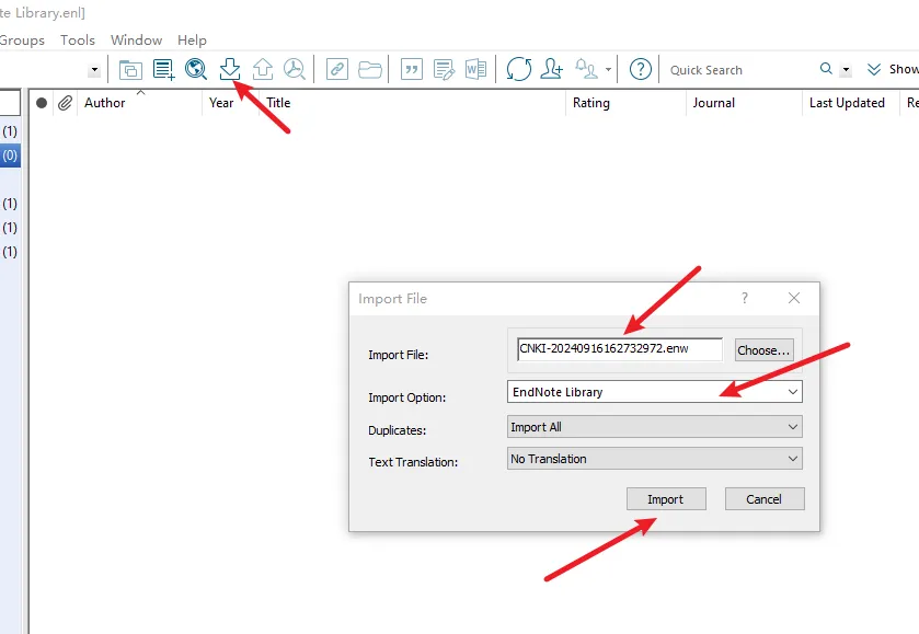 将下载的文件添加至EndNote x9中启动EndNote x9程序,定位到您之前建立的库,点击下方的箭头按钮,在出现的对话框 里点击“选择”,定位到您想要添加的文件,设置导入方式为“EndNote导入”,然后选择“导入”。