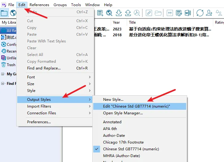 Edit—>Output styles—>Edit"Chinese Std GBT7714 (numeric)"。