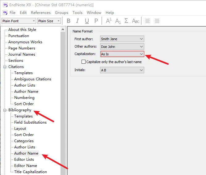 配置好Chinese Std GBT7714 (numeric)后,进行引用外文的时候,你会发现外文名字全部是大写的,这里我们需要设置一下首字母大写。