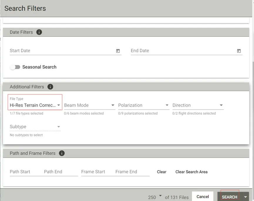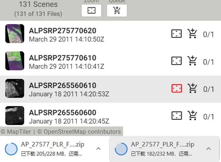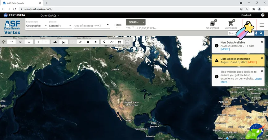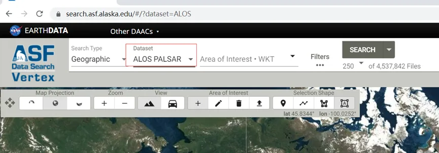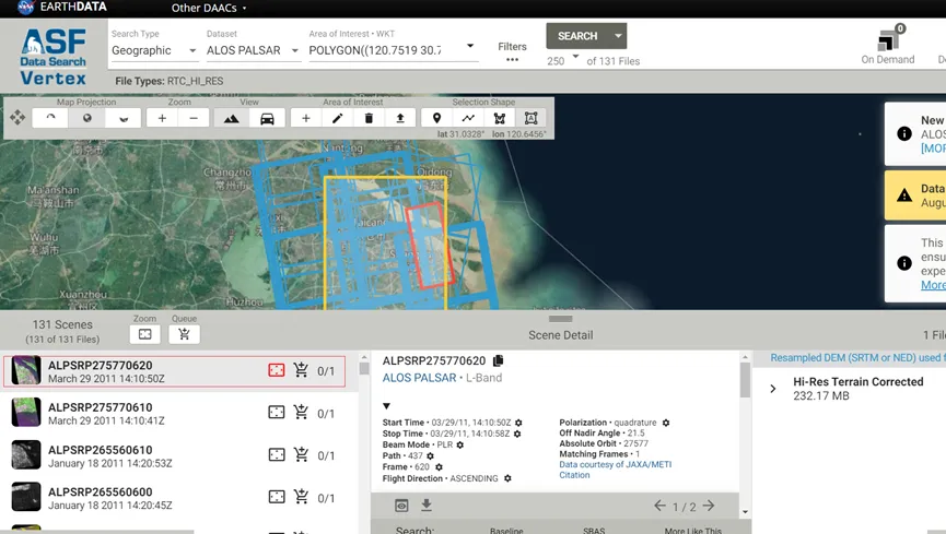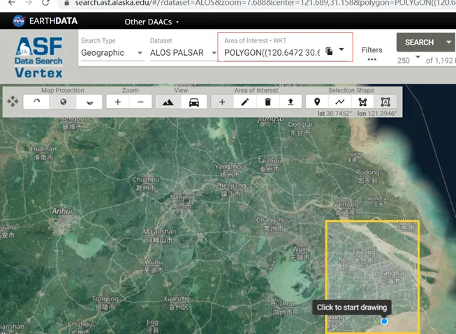 EARTHDATA下载12.5米DEM数据1.在google里打开search.asf.alaska.edu/,打开界面如下,注意登录才能下载4.点击Filters,在弹出的对话框中Hi-Res Terrain Corrected,点击右下角的SEARCH5.弹出下面的界面,点击第一个图像可以看到影像图中的色框位于上海市界内,所以这个数据是要下载的6.点击右下角的下载按钮,可以下载选择区的高程数据