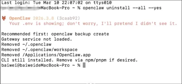 openclaw uninstall --all --yes --non-interactive作用:停止后台 Gateway 服务、删除状态目录、卸载 CLI 包,三件事一次完成。