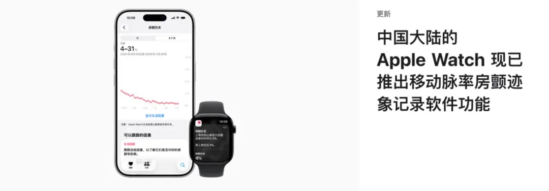 另一条更容易被忽略,但对部分用户更有实际价值的消息,也是在这两天正式落地,Apple 于 2026 年 3 月 17 日宣布,中国大陆的 Apple Watch 已上线移动脉率房颤迹象记录软件功能,它面向的是年满 22 岁、且已经确诊房颤的人群,可以通过 Apple Watch 收集到的心律数据,给出房颤迹象出现频率的估算结果,并提供每周通知,相关历史数据还能在健康 App 里查看,甚至导出 PDF 提供给医生参考