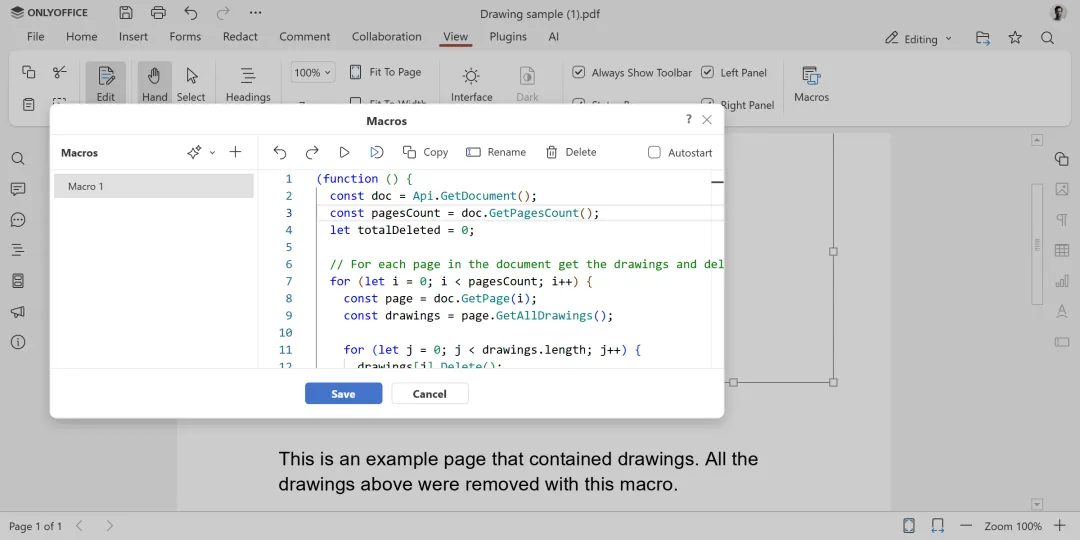 (function () {const KEYWORD = "example";const doc = Api.GetDocument();const pagesCount = doc.GetPagesCount();let deletedCount = 0;for (let i = 0; i < pagesCount; i++) {const page = doc.GetPage(i);const annots = page.GetAllAnnots();if (!annots || annots.length === 0) continue;for (let j = annots.length - 1; j >= 0; j--) {const annot = annots[j];const contents = (annot.GetContents() || "").toLowerCase();if (contents.includes(KEYWORD.toLowerCase())) { annot.Delete(); deletedCount++; } } }console.log("Deleted annotations containing keyword:", KEYWORD);console.log("Total deleted:", deletedCount);})();宏运行后,文档中包含指定关键词的每一个注释都会被移除。要指定其他的关键词,只需更新代码顶部的KEYWORD变量即可。