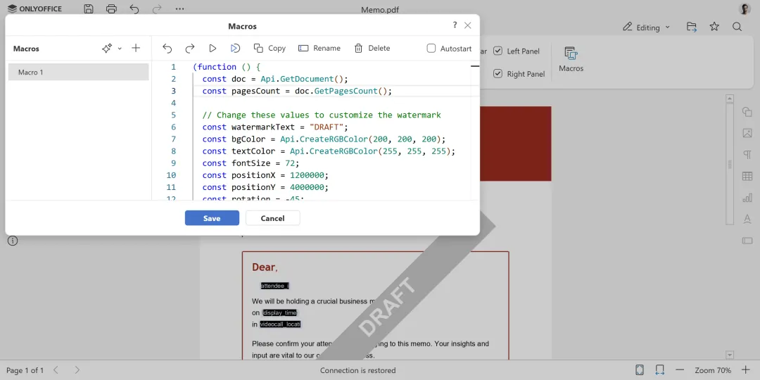 我们的最后一个宏创建了一个可自定义的水印形状,并将其放置在文档的每一页上。它使用 SetPosition() 将形状精确放置在页面坐标上,并使用 AddObject() 将其添加到每一页。