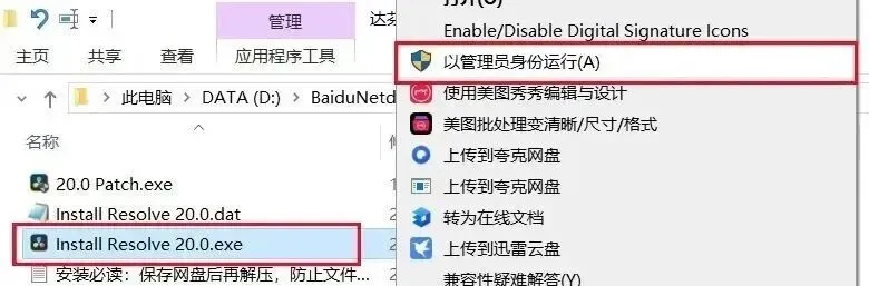 3、找到【Install Resolve 20.0】应用程序,右键选择【以管理员身份运行】