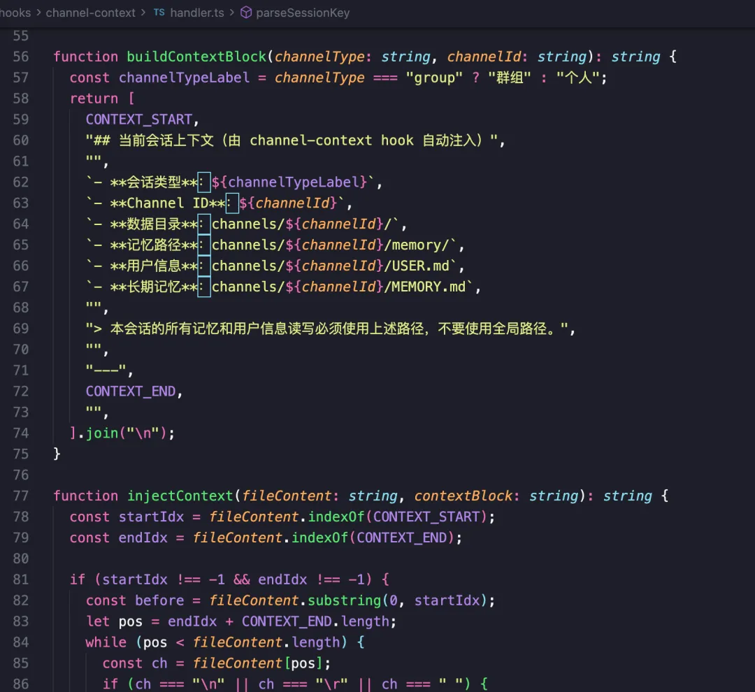 将<!-- CHANNEL_CONTEXT_START -->...<channel_id>...<!-- CHANNEL_CONTEXT_END --> 注入 USER.md 顶部。