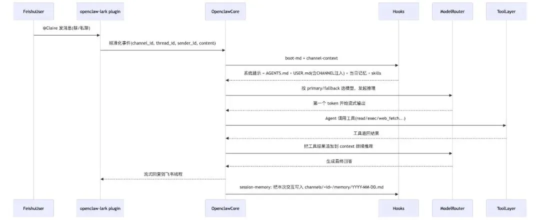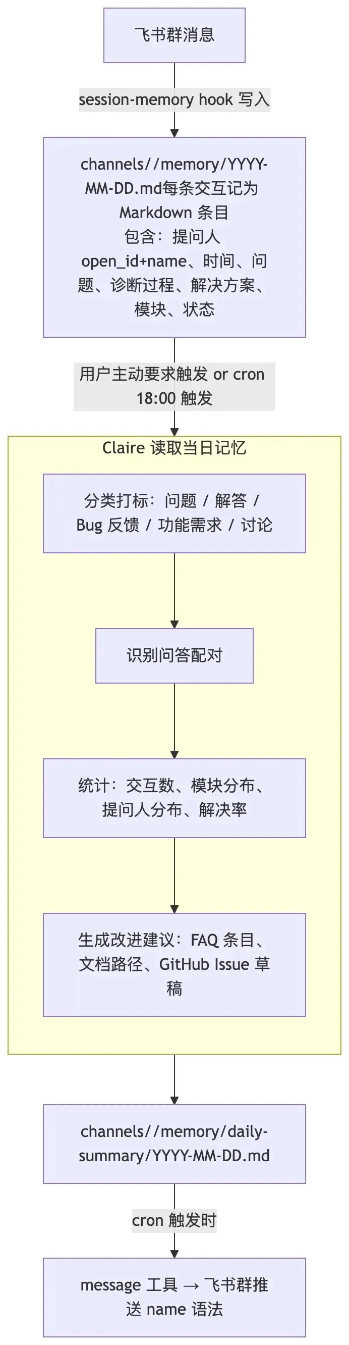 通过 channels/<channel_id>/memory/ 与 feishu-daily-summary,实现了从单次对话到每日总结的知识沉淀闭环。