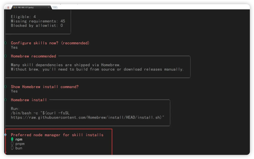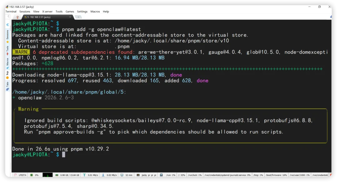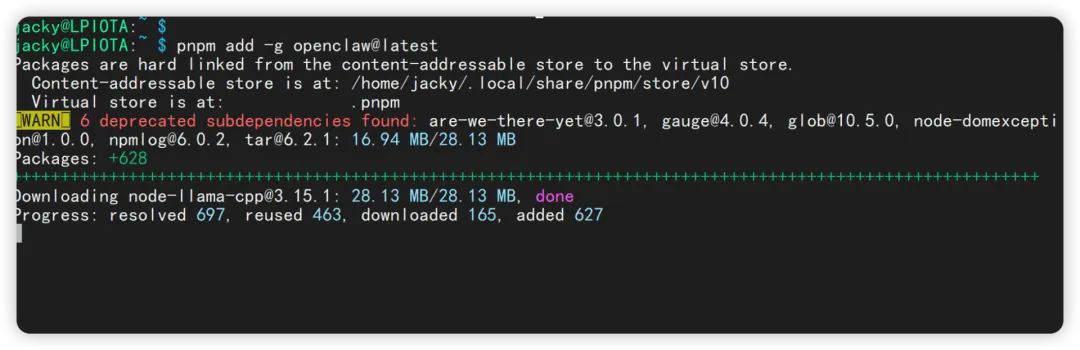 node -vnpm -v安装 pnpmsudo npm install -g pnpm@latestpnpm setupsource ~/.bashrcpnpm add -g openclaw@latest