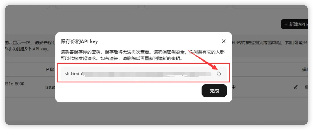 复制你的 key,这个 API key 只能出现一次,记得保存好。