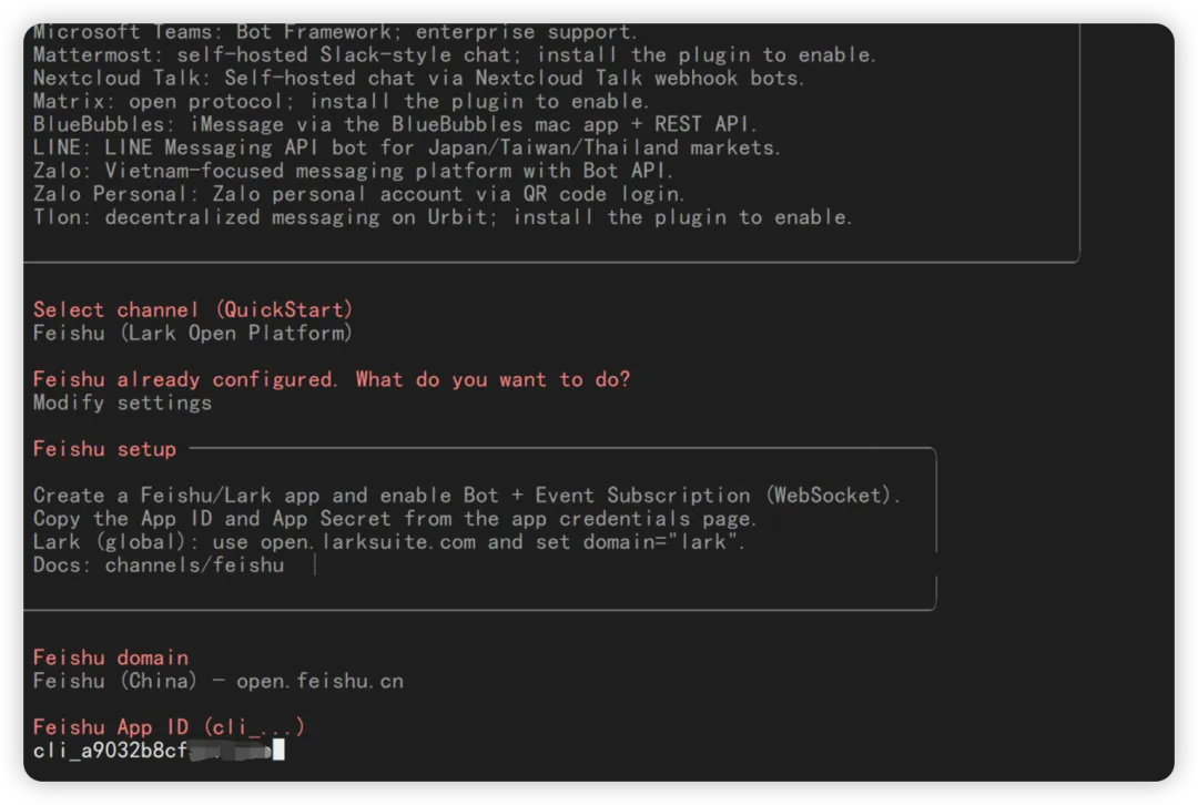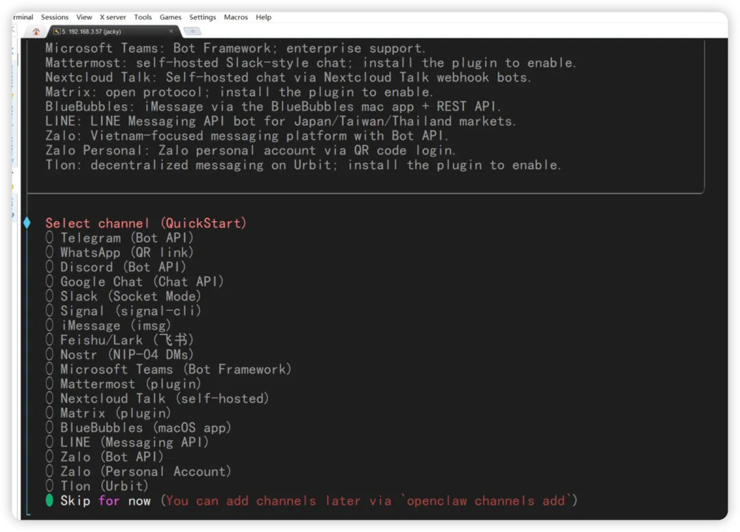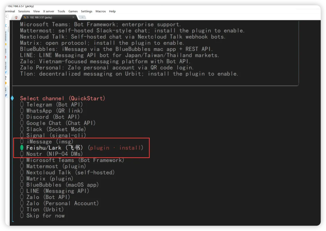 下面要选择通道,就是 channel,如果要和飞书交互,国内目前就飞书非常方便。