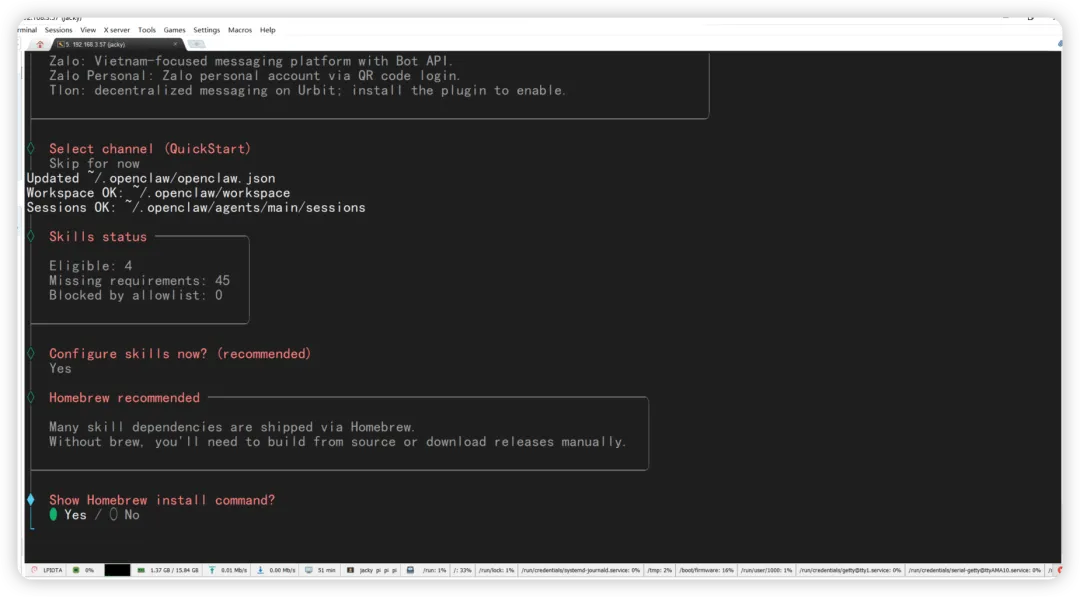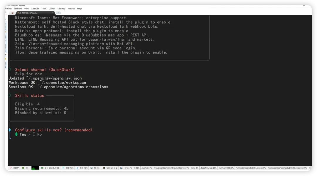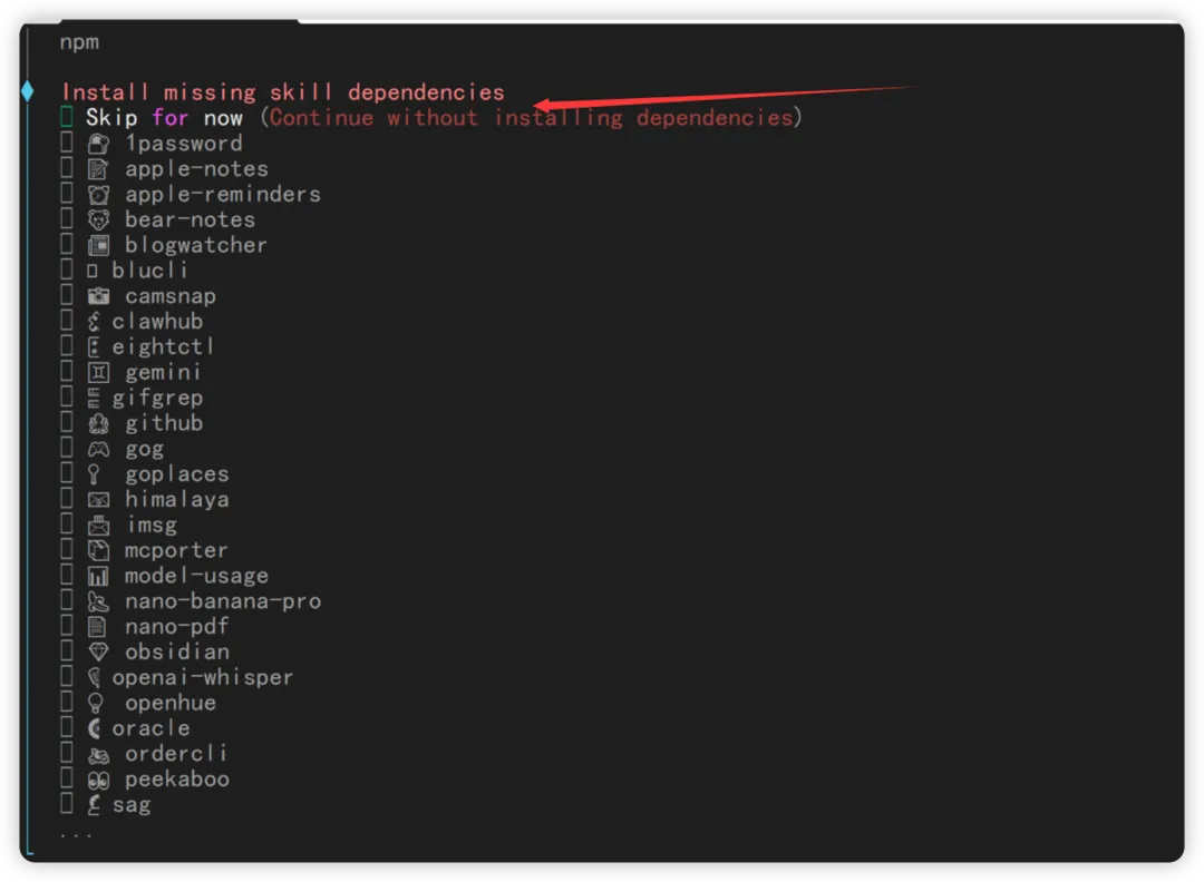 询问是否配置 skills,我建议直接跳过,都是 Mac 上的应用,而且也没啥用。