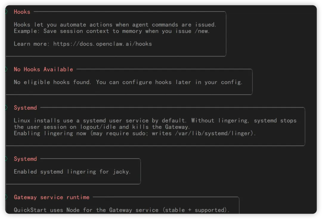 等待完成后,记得启动 openclaw 的 gateway,这个服务是它核心的关键。