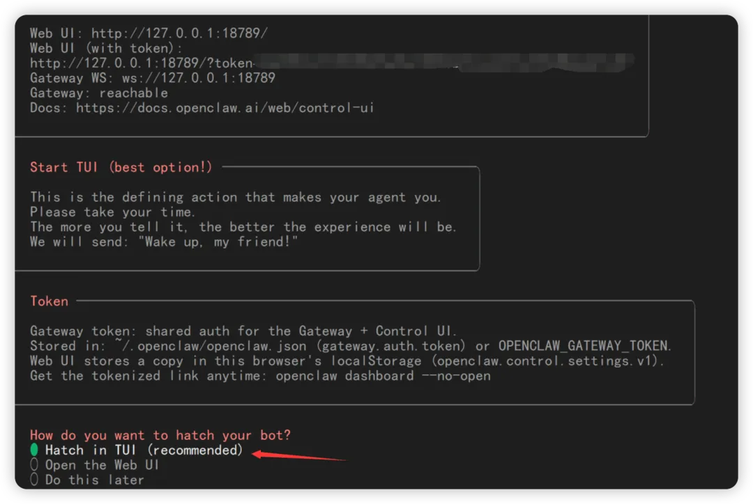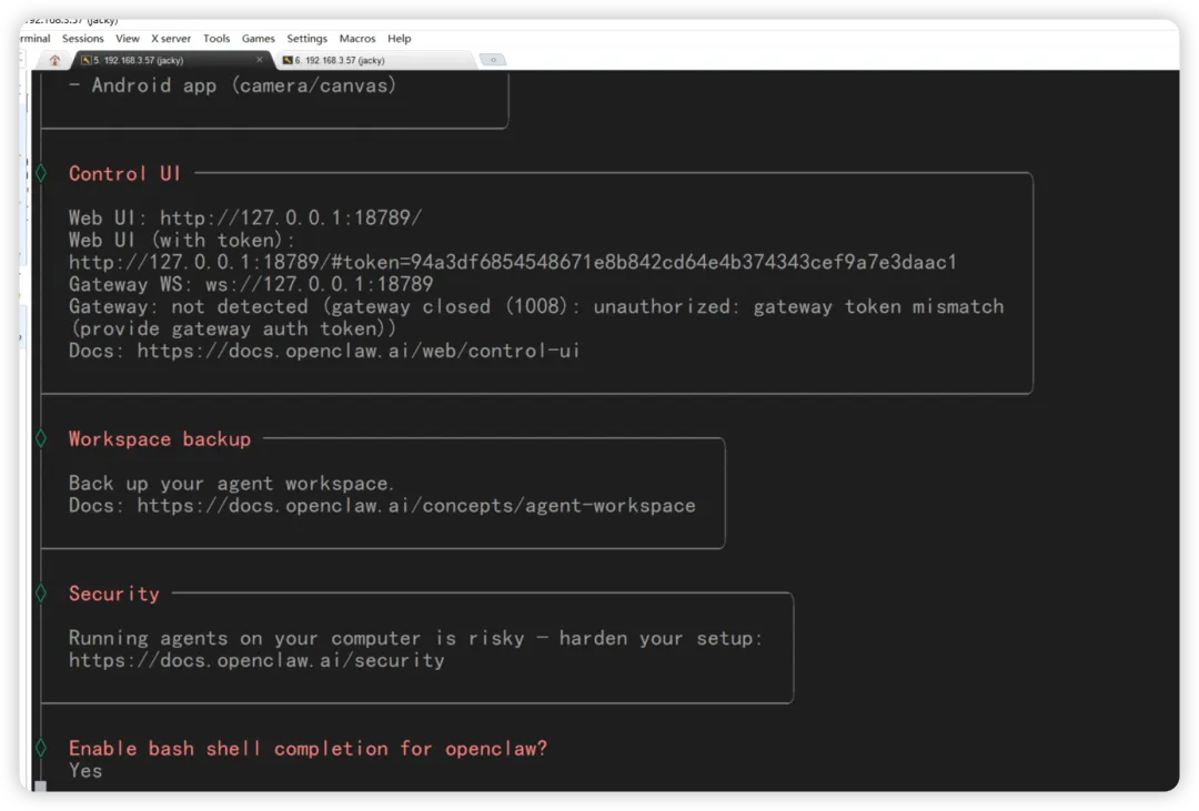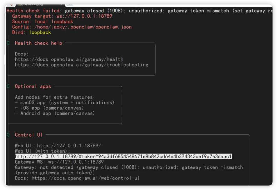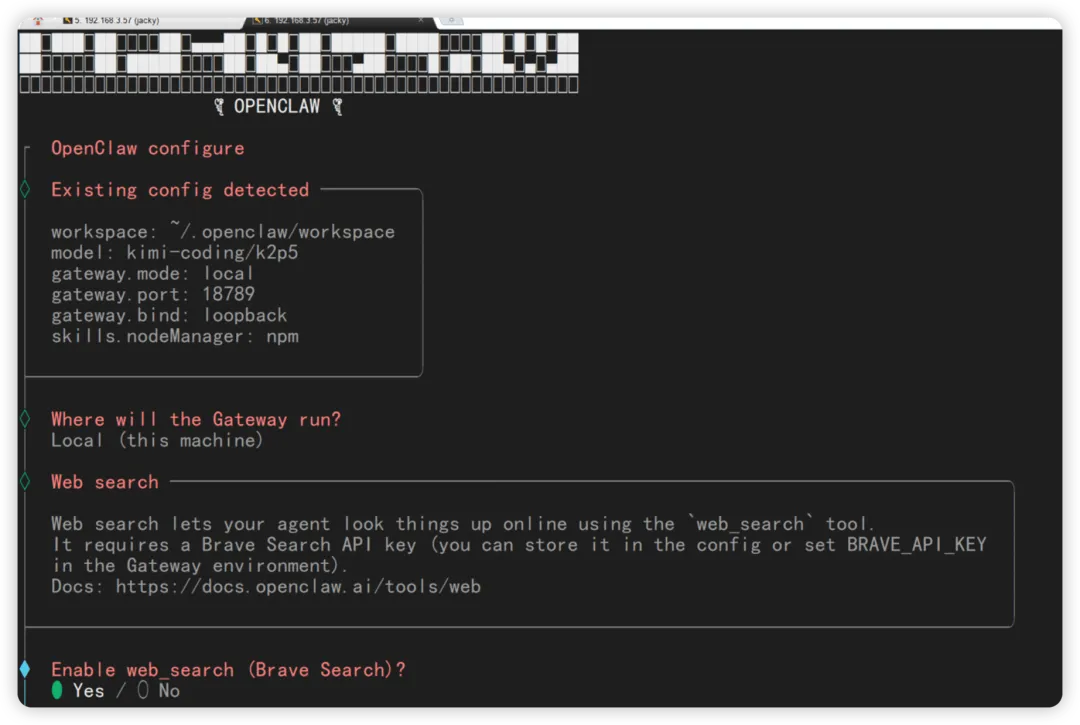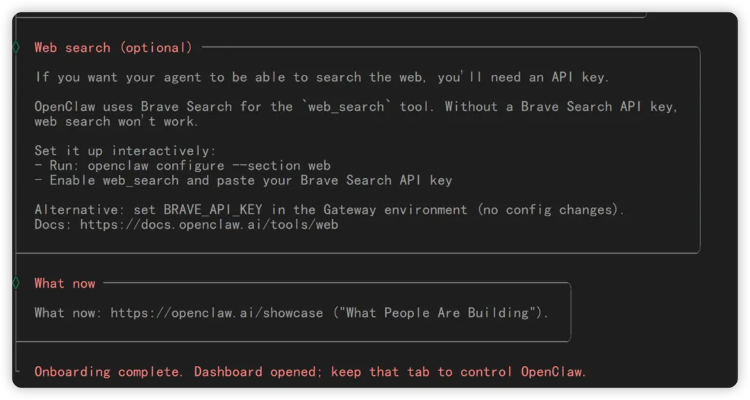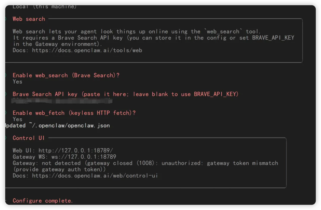 另外,可以开一个终端执行openclaw configure --section web 调整 web 相关的应用。
