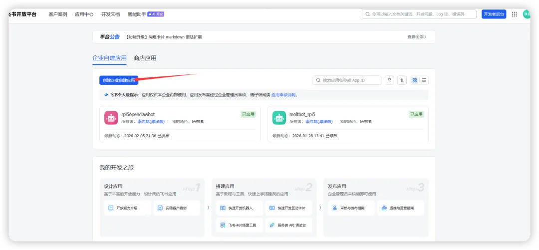 当 gateway 正常启动后,可以通过 openclaw onboard 进入配置,找到飞书的配置,来配置飞书的机器人。 不过先需要登录到飞书进行配置:https://open.feishu.cn/cpp