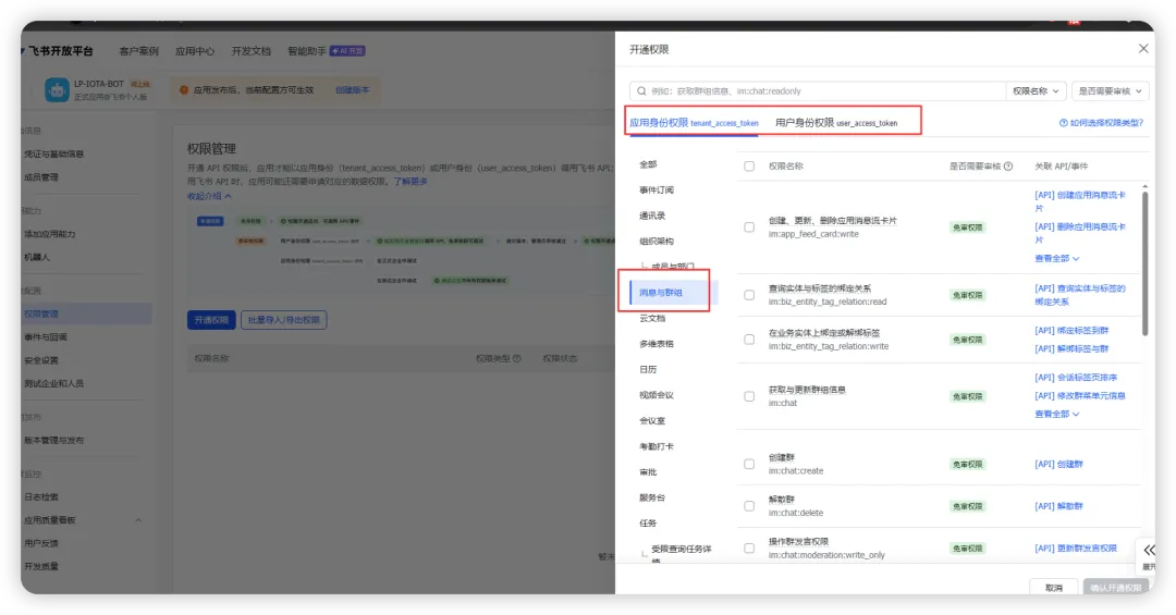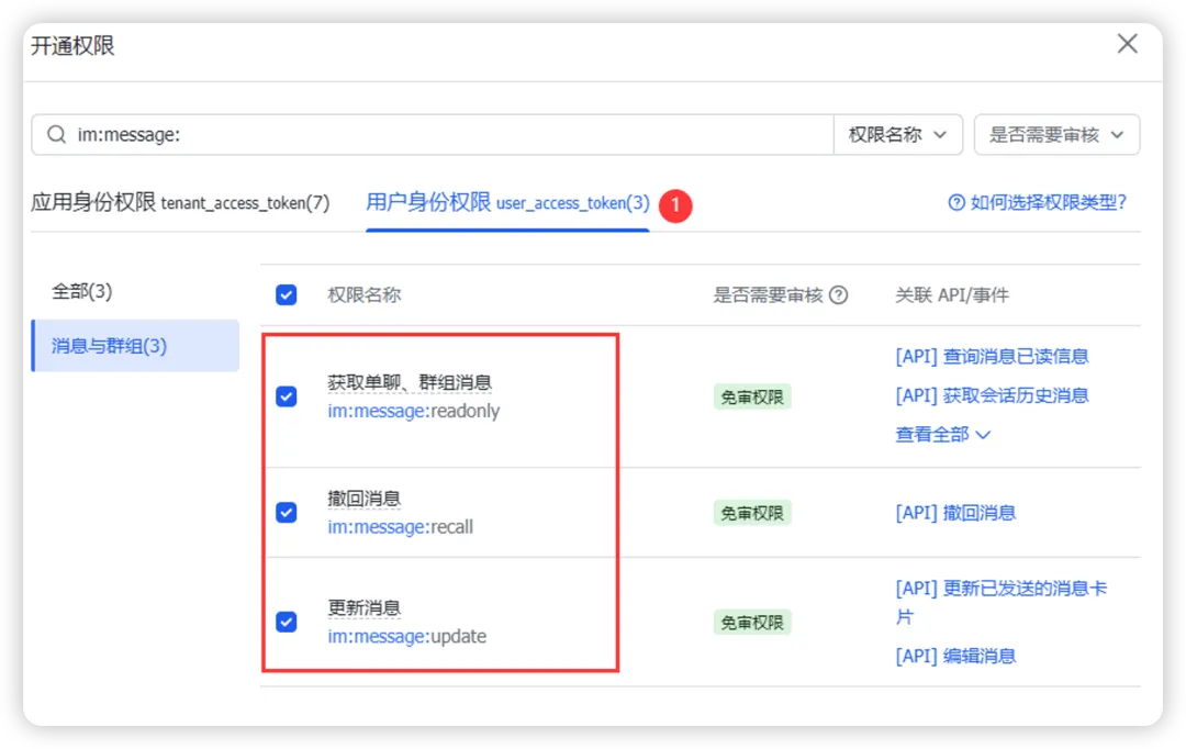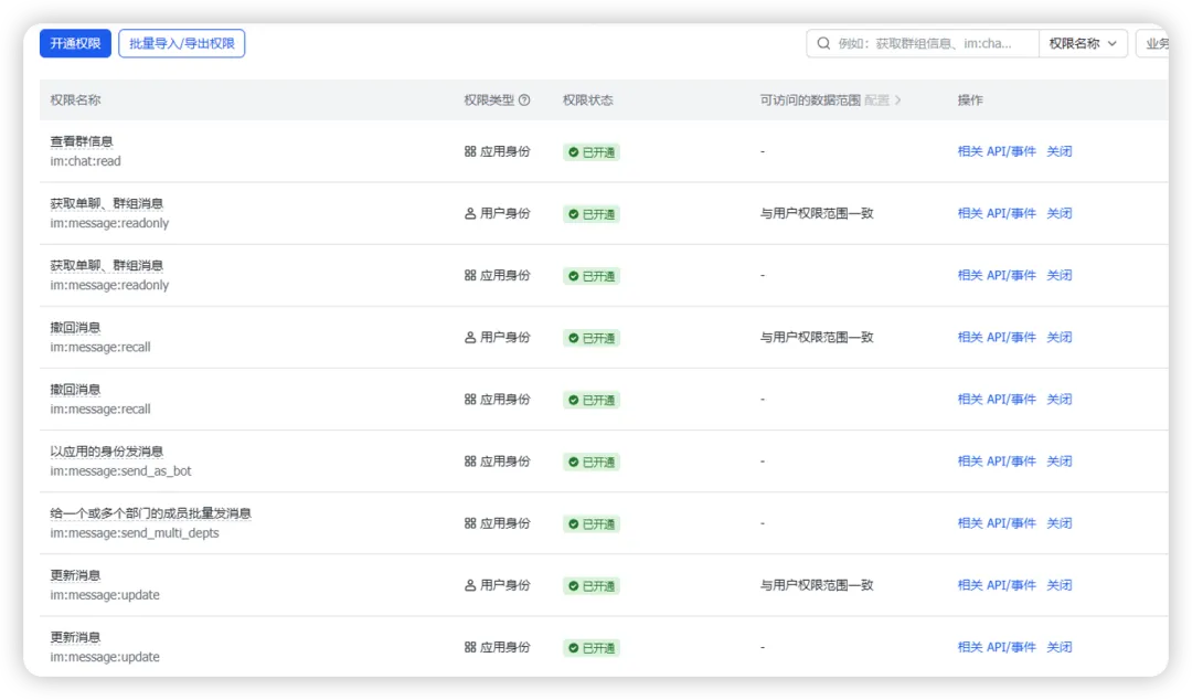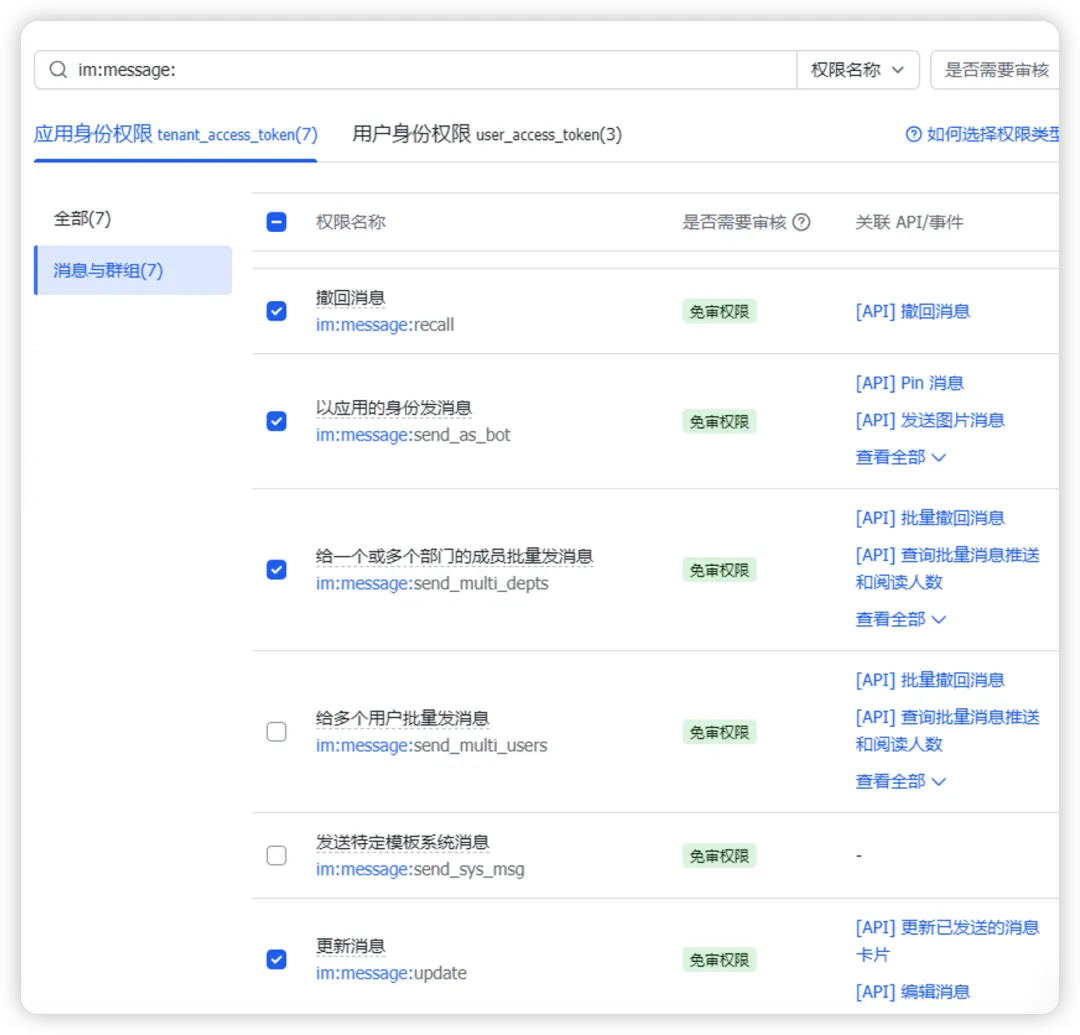 我简单配置了一下im:相关的权限,输入im:message ,然后看看哪些可以用。