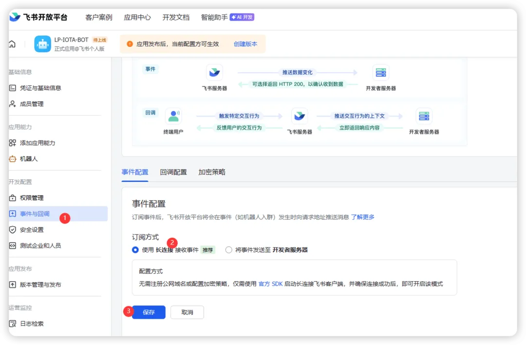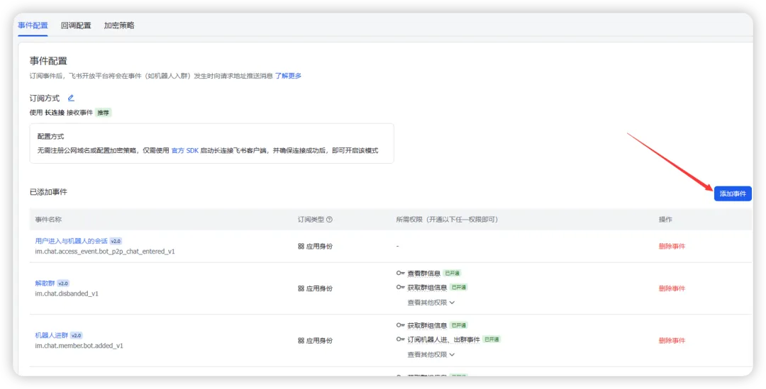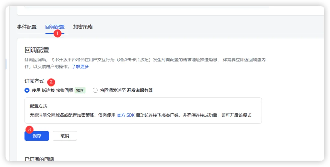 配置事件与回调,订阅方式长连接,