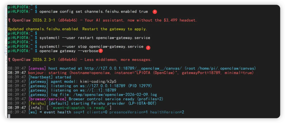 我尝试激活了飞书插件,然后重启了 gateway,不过为了看到启动日志,我就加了--verbose 的参数,看到飞书插件已经启动。