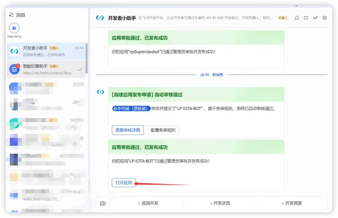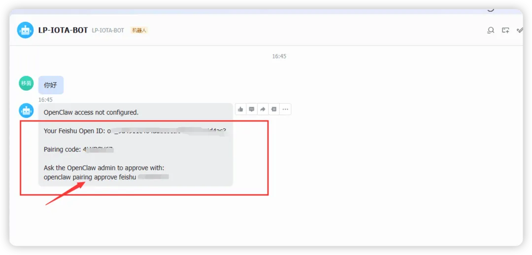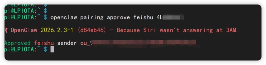 第一次交互会让你 pairing approve 一下飞书。