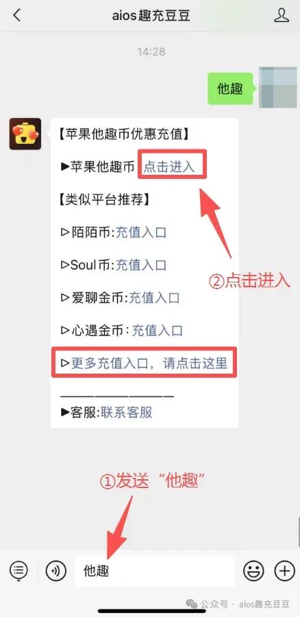 2、获取入口:在公众号对话框中发送关键词“他趣”,即可自动收到他趣币优惠入口。