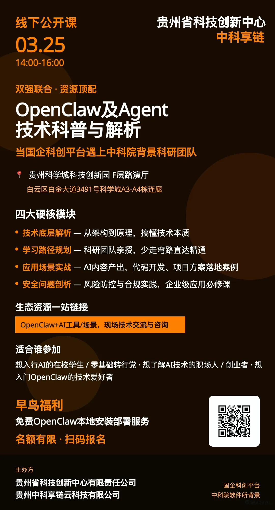 由「贵州省科技创新中心有限责任公司」携手具备中科院软件所技术背景的科研转化平台「贵州中科享链云科技有限公司」,联合打造本次线下公开课。我们致力于提供客观、专业、深入的技术解析,帮助大家拨开信息迷雾,建立对OpenClaw及Agent技术的正确认知,把握发展机遇。