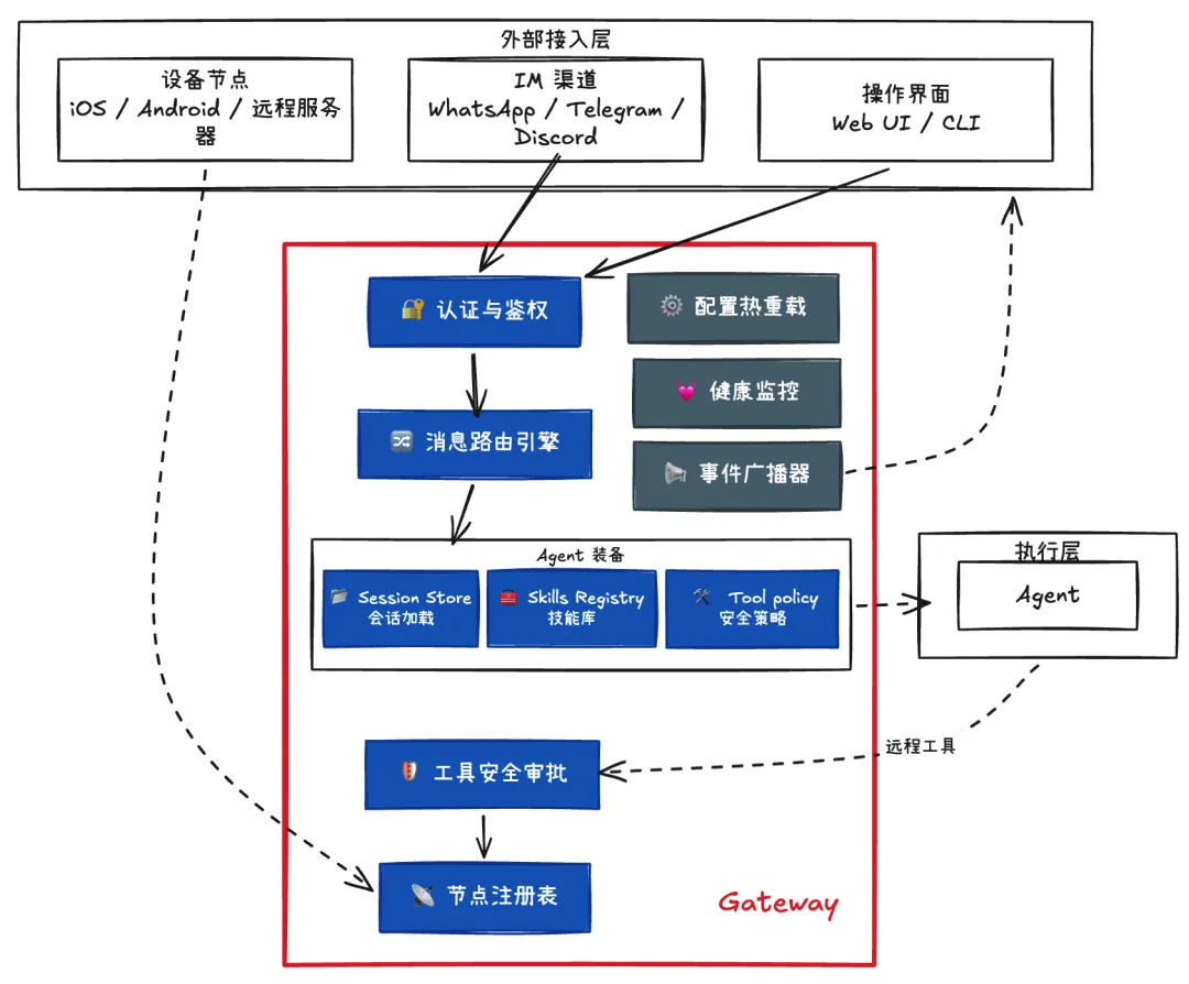 把它翻成人话,OpenClaw 的核心做法其实很直接:先放一个长期运行的 Gateway 当总中枢,所有消息入口都先接到这里。官方文档写得很明白,一个 Gateway 会统一接管 WhatsApp、Telegram、Slack、Discord、Signal、iMessage 这些消息面;控制端客户端,比如 macOS app、CLI、Web UI、自动化模块,会通过 WebSocket 连到 Gateway,默认绑定在 127.0.0.1:18789;iOS、Android 或无头节点也会以 node 身份接进来,并声明自己的能力和允许执行的命令。说白了,Gateway 就像总机房,外面所有消息先汇进来,里面所有动作再从这里发出去。)