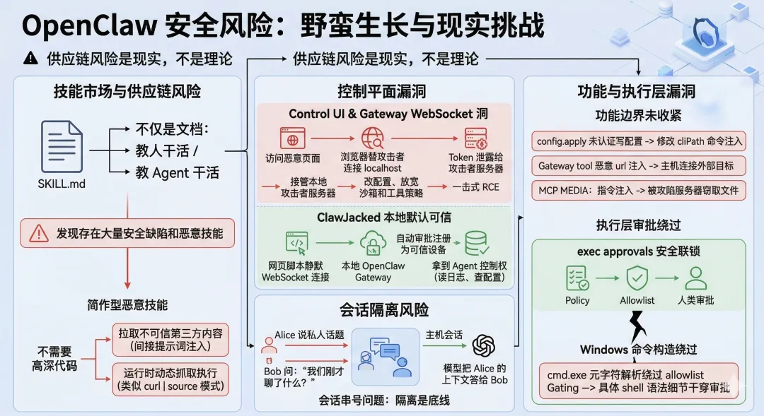 执行层也没少出事。官方的 exec approvals 文档本来把这套东西描述成“安全联锁”,意思是 policy、allowlist 和可选的人类审批三者都同意,命令才能落到真实主机上。但 GitHub Advisory 里后来又披露了 Windows 节点的 cmd.exe 解析绕过问题:由于 allowlist/approval gating 没有真正建模 Windows cmd.exe 的元字符行为,构造过的命令字符串可以让 cmd.exe 额外解释出允许名单之外的操作。这个问题很说明本质:字符串级审批看起来很像安全,实际上很容易被具体 shell 的语法细节狠狠干穿。