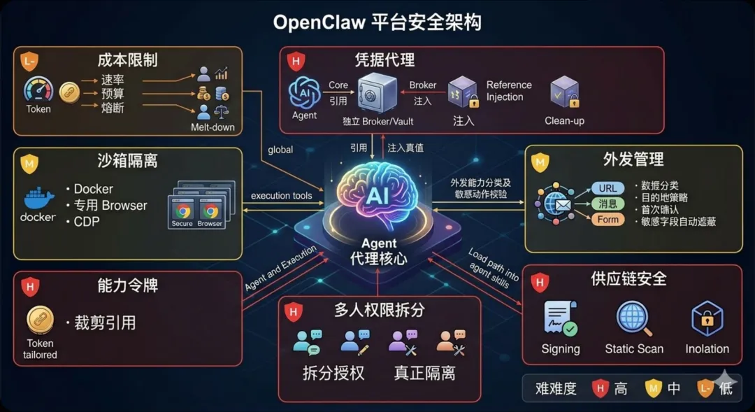 把 browser / exec 的“字符串权限”升级成“能力令牌”。难度:高。官方社区的安全加固路线图里已经提过 Browser Path Sanitization、Subagent Session Isolation (浏览器路径清理、子代理会话隔离)这些方向,本质就是不要让 agent 拿到原始路径和过宽的主机执行能力,而是拿到被裁剪过的能力引用。我的判断是,这才是长远上最对路的做法:不是问“这个命令像不像危险命令”,而是让 agent 根本没有机会接触太宽的资源地址空间。难点也显而易见,要改的不只是一个 tool,而是整套资源访问模型。