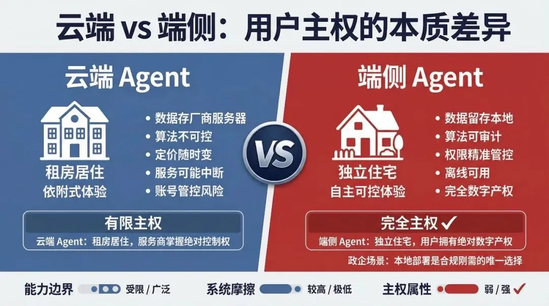 用户主权最高:本地 Agent 是数字世界的“独立住宅”本地 Agent 数据留存本地、算法可审计、权限可精准管控,用户拥有绝对数字产权;云端 Agent 则如同“租房居住”,服务商掌握绝对控制权,用户始终面临算法、定价、账号管控的不可控风险。尤其在政企场景中,本地部署、数据不出境的端侧方案,更是合规刚需的唯一选择。