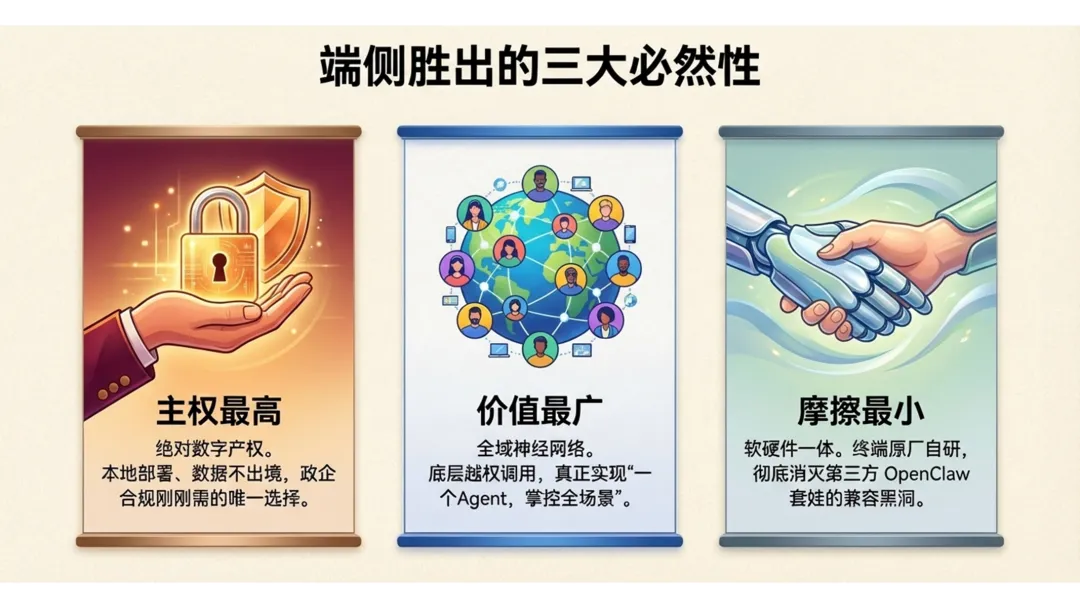 在 AgentOS 的终局竞争中,端侧成为终极主场,是三大不可逆转的必然性共同作用的结果: