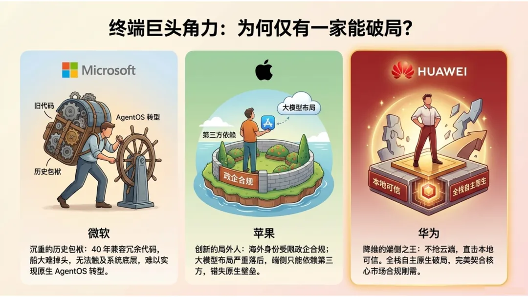 在这场 AgentOS 终局之战中,全球仅有微软、苹果、华为三家厂商具备原生改造能力,三者的发展路径与核心竞争力分化显著,华为的端侧原生优势正成为破局关键。