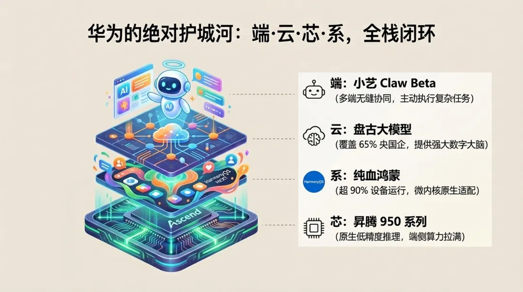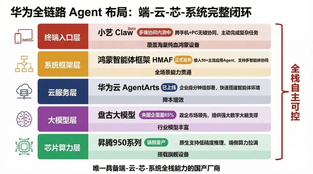 华为并非跟风入局 OpenClaw,而是提前布局端侧智能体,已形成“端 - 云 - 芯 - 系统”完整闭环,核心产品与技术全面落地: