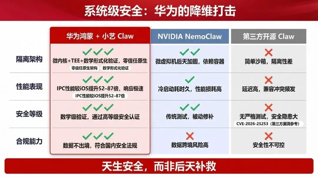 安全是 AgentOS 的核心底线,华为凭借原生架构实现对第三方方案的降维打击,是天生安全而非后天补救: