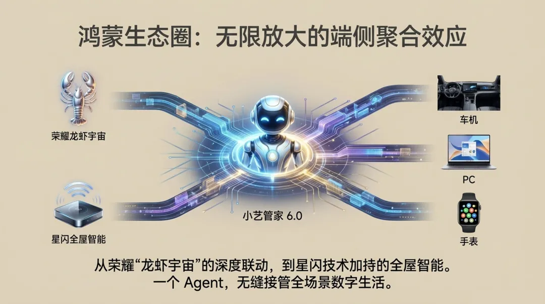 华为端侧 Agent 的价值,通过生态协同持续放大,形成聚合效应:荣耀“龙虾宇宙”与鸿蒙生态深度联动,实现多设备智能体接力;小艺管家 6.0 全面接入全屋智能,星闪技术加持下,连接速度、设备承载量大幅提升,功耗显著降低;华为云 AgentArts 吸引大量企业开发者,行业专属智能体覆盖多领域,政企生态持续完善。