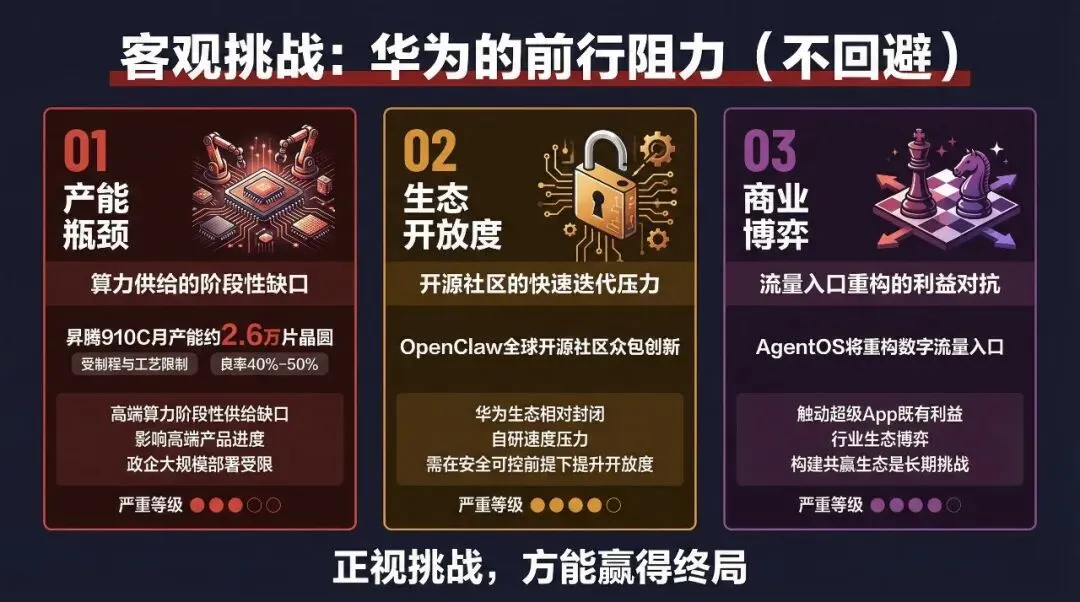 AgentOS 将重构数字流量入口,触动传统超级 App 的既有利益,未来将面临行业生态博弈与利益对抗,如何构建共赢生态,是华为需要长期应对的挑战。