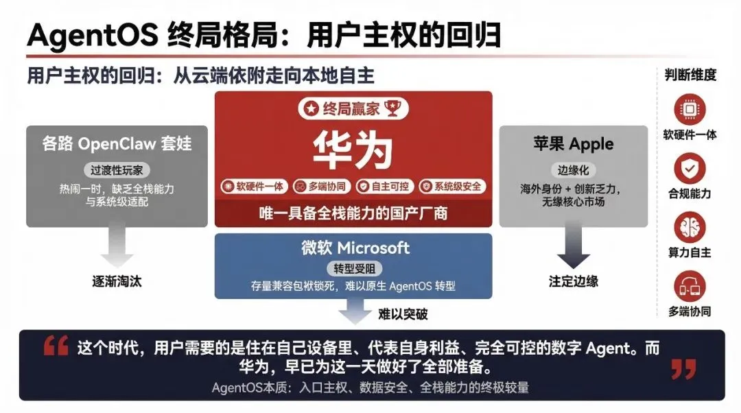 在这场终局之战中:各路 OpenClaw 套娃热闹一时,缺乏全栈能力与系统级适配,只是过渡性玩家;微软被存量兼容包袱锁死,难以实现原生 AgentOS 转型;苹果受海外身份与创新乏力限制,无缘核心市场,注定边缘化; 华为是唯一具备软硬件一体、多端协同、自主可控、系统级安全的国产厂商,完美匹配用户专属感与价值感的双重诉求,契合国家合规与安全刚需,是 AgentOS 格局的最终赢家。