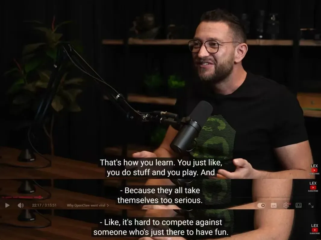 我顺手就去翻了翻OpenClaw创始人Peter Steinberger的访谈,正好看到知名科技播客主持人Lex Fridman问了他同样的问题。Peter的回答很短,但一下子击中了我: