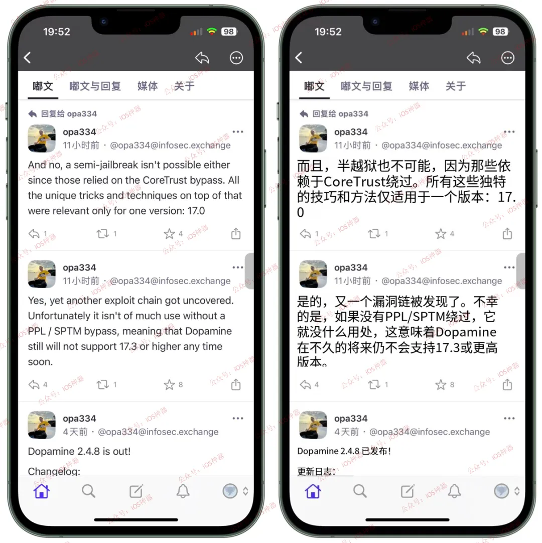 2、半越狱也不行,因为那些方法都依赖于 CoreTrust 绕过。所有独特的技巧和技术,仅适用于一个版本:17.0。