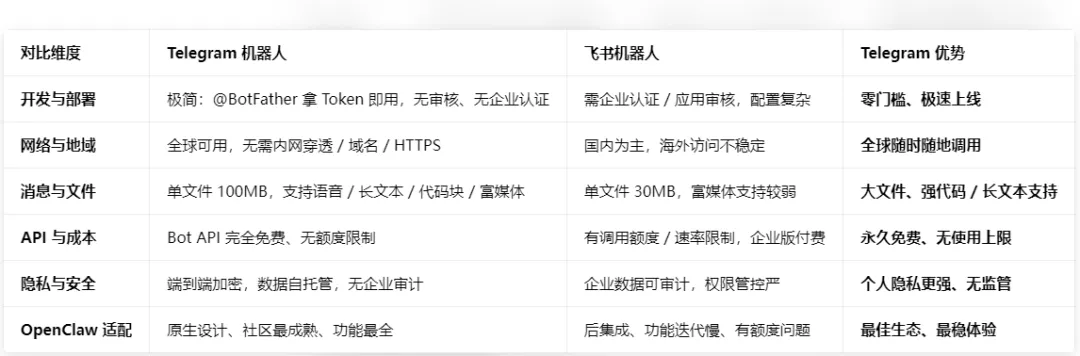 :Telegram Bot API 完全免费、无消息额度、无调用频率限制,个人 / 小团队用零成本,无额度焦虑。 - 对比飞书
