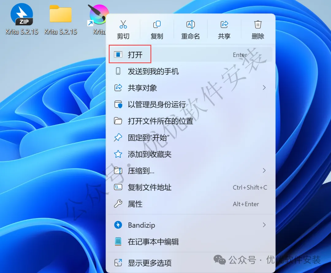 15、回到桌面,右键桌面上的【Krita软件图标】,点击【打开】