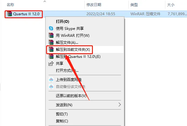 1.打开下载的Quartus软件安装包,鼠标右击压缩包选择【解压到当前文件夹】。