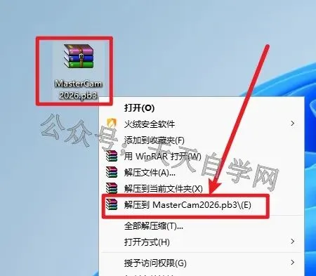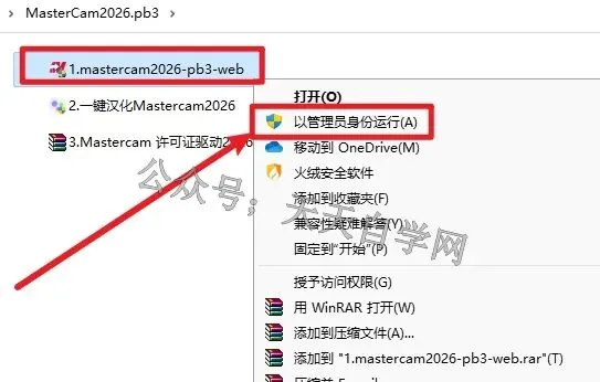2.打开解压好的文件夹,选中1.Mastercam2026-pb3,点击鼠标右键选择以管理员身份运行