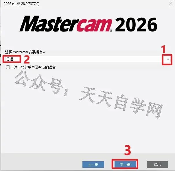 5.点击下拉选项,选择 英语。然后点击下一步。
