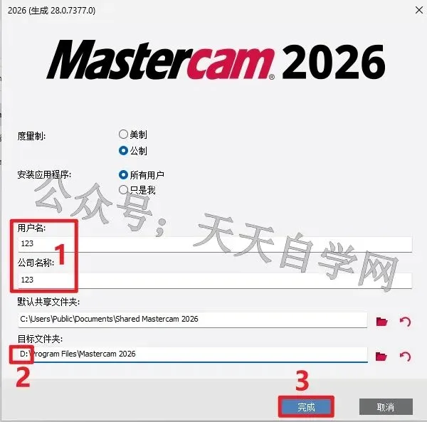 7. 用户名和公司名随意输入,将目标文件夹路径中的C改为D(改为D表示装到D盘),然后点击完成