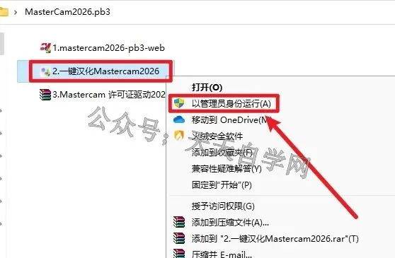 12.回到安装包,选中2.一键汉化Mastercam2026..点击鼠标右键选择以管理员身份运行。