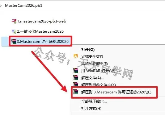 16.选中3.Mastercam 许可证驱动.........点击鼠标右键选择 解压到3.Mastercam 许可证驱动.........
