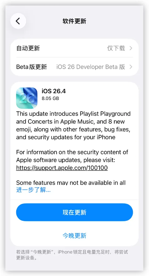 凌晨收到了苹果推送的iOS 26.4(23E6244)与18.7.7(22H333)RC版,不知道你们有没有收到,这次老果粉特别欣慰,因为这次的更新没有以前那些砌花哨功能,反倒更能击中的我们日常吐槽的核心痛点,实测下来有很多项体验都迎来质的改变,可以说是从实用向重磅的更新了