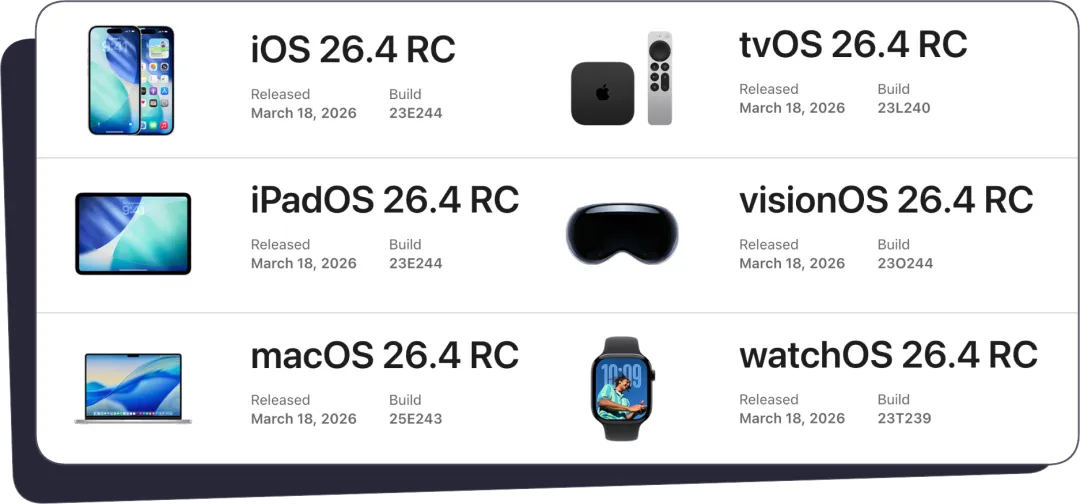 苹果在今天凌晨向参与测试的设备推送了新一轮系统更新,本次为 RC 版本,包括 iOS 26.4 RC、macOS 26.4 RC 等。