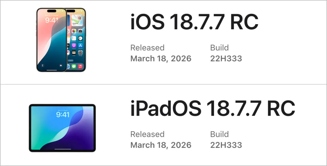 与此同时,苹果今日还发布了 iOS/iPadOS 18.7.7 RC,预计正式版同样会在下周推出。不过这个版本仅面向不支持 iOS 26 的旧机型,包括 iPhone XR、iPhone XS 和 iPhone XS Max。