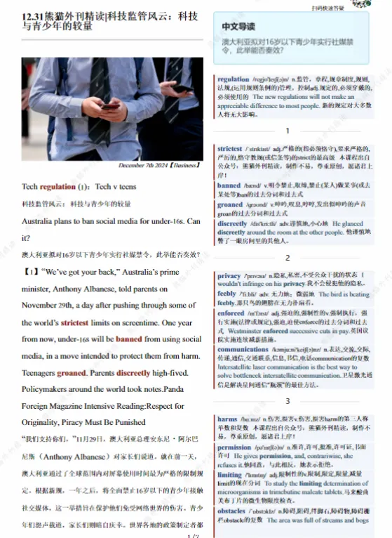 精读小提示:重点关注各国的监管措施(如澳大利亚禁止16岁以下青少年使用社交平台、希腊课堂禁用手机),这些内容简单易懂,还能积累“ban(禁止)”“limit(限制)”等常用动词,以及“parent control(家长控制)”等实用短语,逐句精读,每天15分钟,轻松完成学习任务。